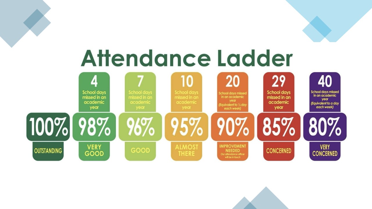 It is vital that your child is on time and in school every day. If your child is not in school we cannot teach them. If they are late they will miss the start of the lesson and could struggle to keep up with the rest of the children. Some parents / carers believe that being absent from school occasionally sometimes is ok but these days soon add up. Good attendance is vital if your child is to achieve and make good progress.